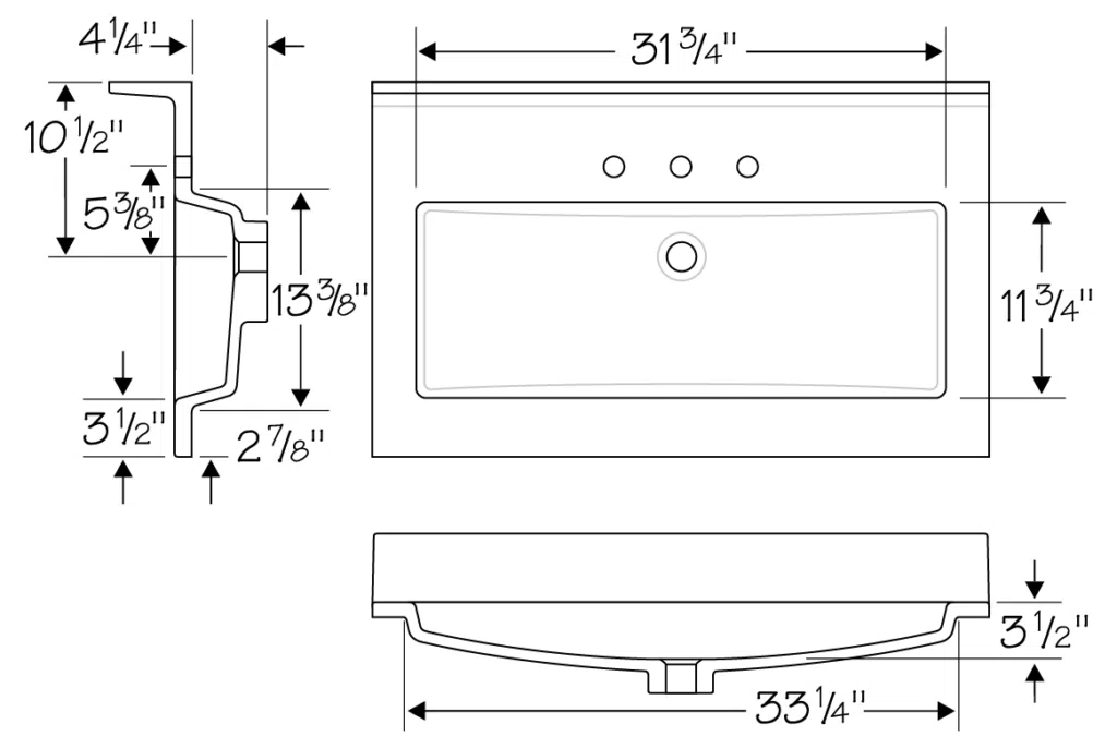 Most cabinets are 18″ or 21″ deep. For 18″ deep vanity cabinets, we recommend using our 19 1/2″ deep lavatory option, and for 21″ deep vanity cabinets, we recommend our 22 1/2″ deep lavatory option. We also offer lavatories in any custom depth you would prefer.