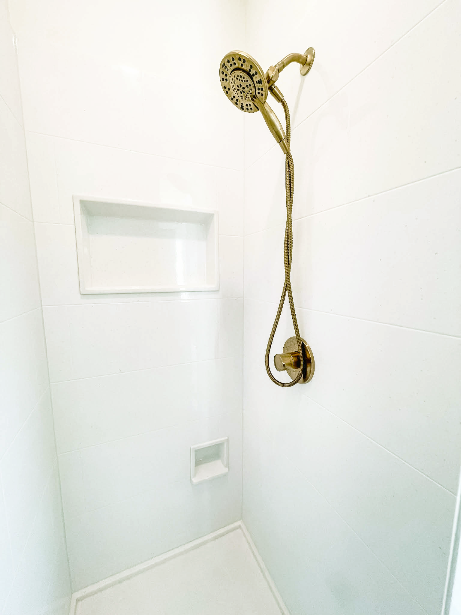 Our Artisan Wall Panel has virtual grout lines to give a tile look, without the worry of leaking grout seams. Integral Stripe Inlays are not available. Tile Size: 24” x 11 9/16”.